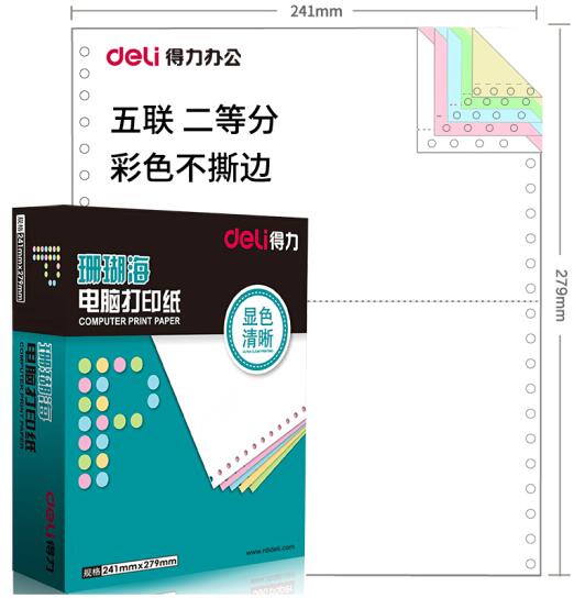• 商品名称:得力(deli)珊瑚海S241-5-1/2C五联二等分彩色不撕边电脑打印纸80列(色序:白红蓝绿黄 1000页/箱)