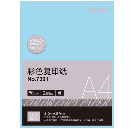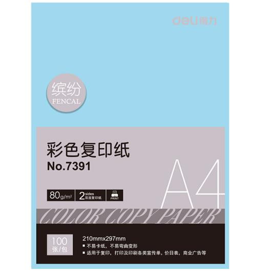 • 商品名称:得力(deli) 7391A4 浅蓝色彩色复印纸 80g 100张/包 单包装